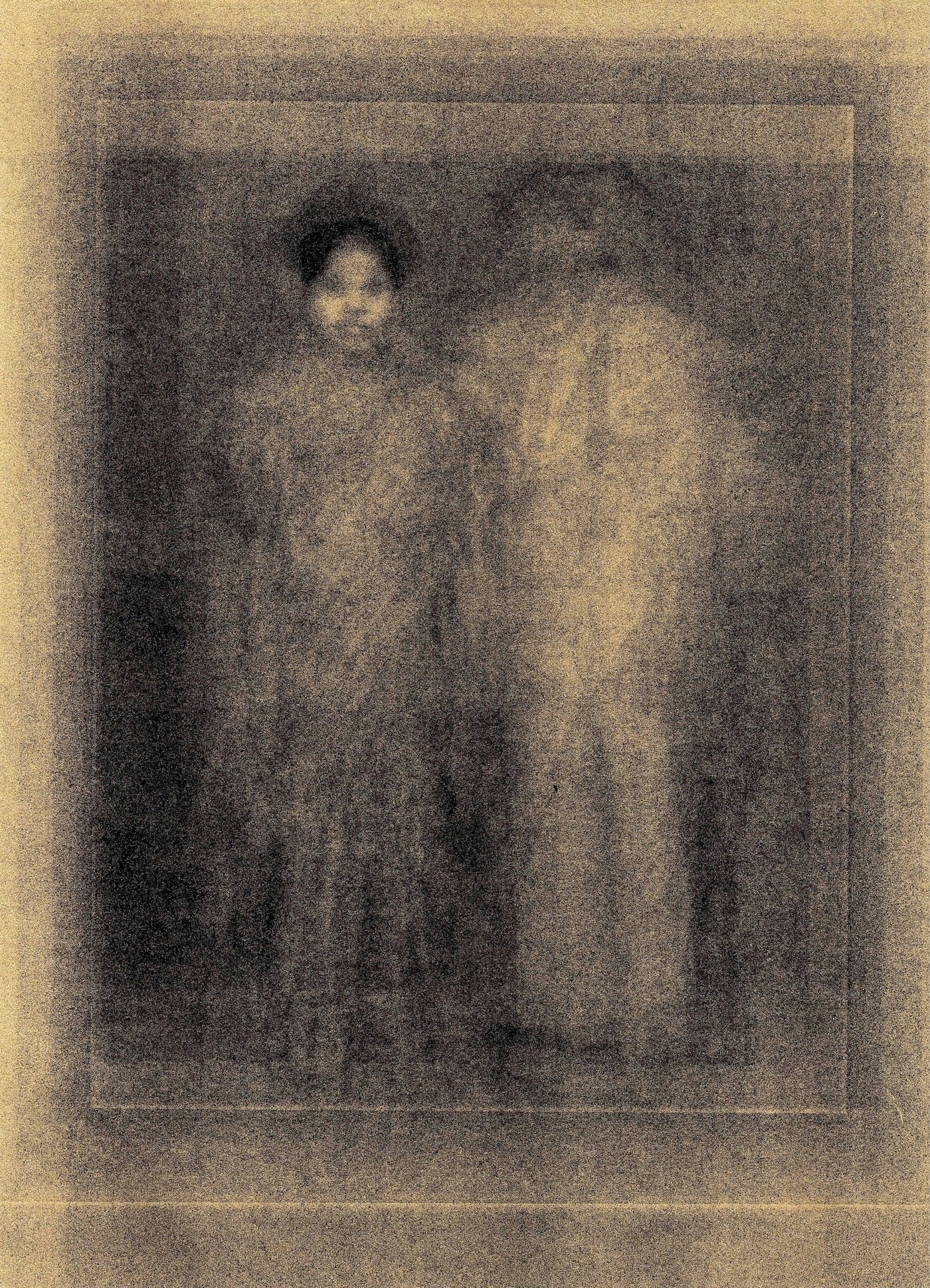 Gold Risograph (on matte black paper) print of computationally averaged similar photos from the Studies in Tamil Studio Archives and Society.
